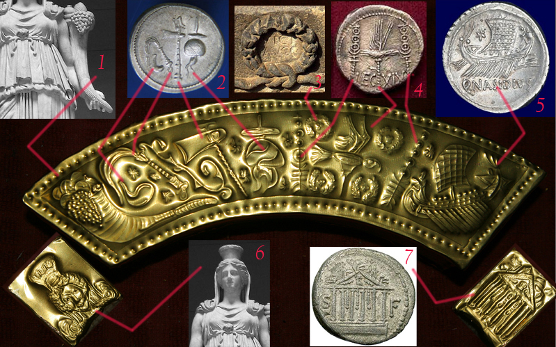 wreaths, such as those found on Roman coins and the Augustus statue platform