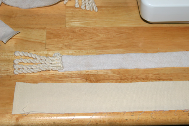 I found it far easier to leave the cotton fringe intact, slip each strip of felt under, sewed it all as one long piece, and then cut each of the Pteruges out.